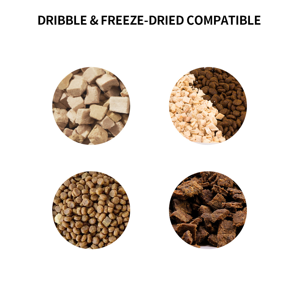 The feeder is compatible with dry kibble and freeze-dried kibble. Avoid dry kibble with a diameter over 12mm (0.47in) or freeze-dried kibble with a diameter over 9mm (0.35in).